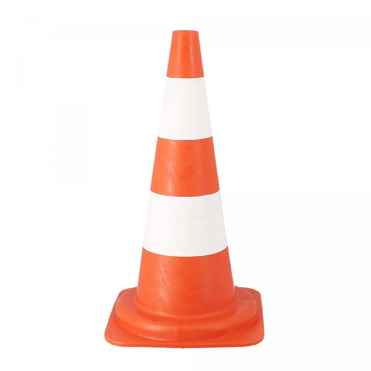 Cône de signalisation en plastique rouge teinté dans la masse avec bandes blanches réfléchissantes.