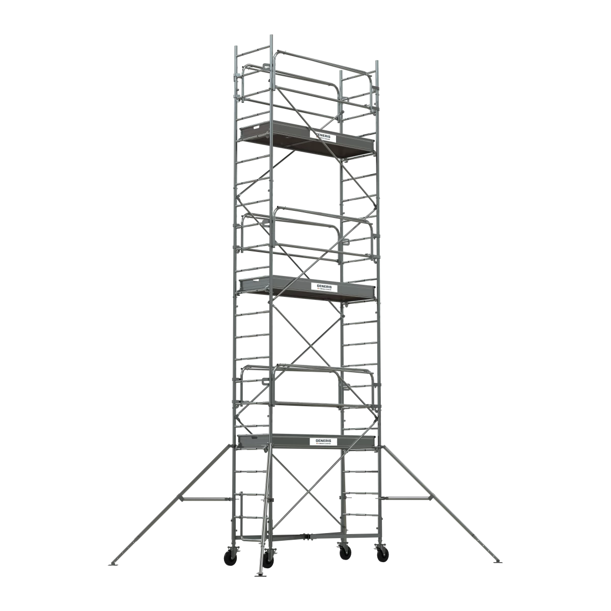 L’échafaudage Generis 750 est en acier galvanisé soudé avec un plancher bac de 190 x 65 cm (dimensions intérieures), ce qui lui procure une très grande stabilité. Il dispose de roues de ø 200 mm réglables pour tout types de sol.