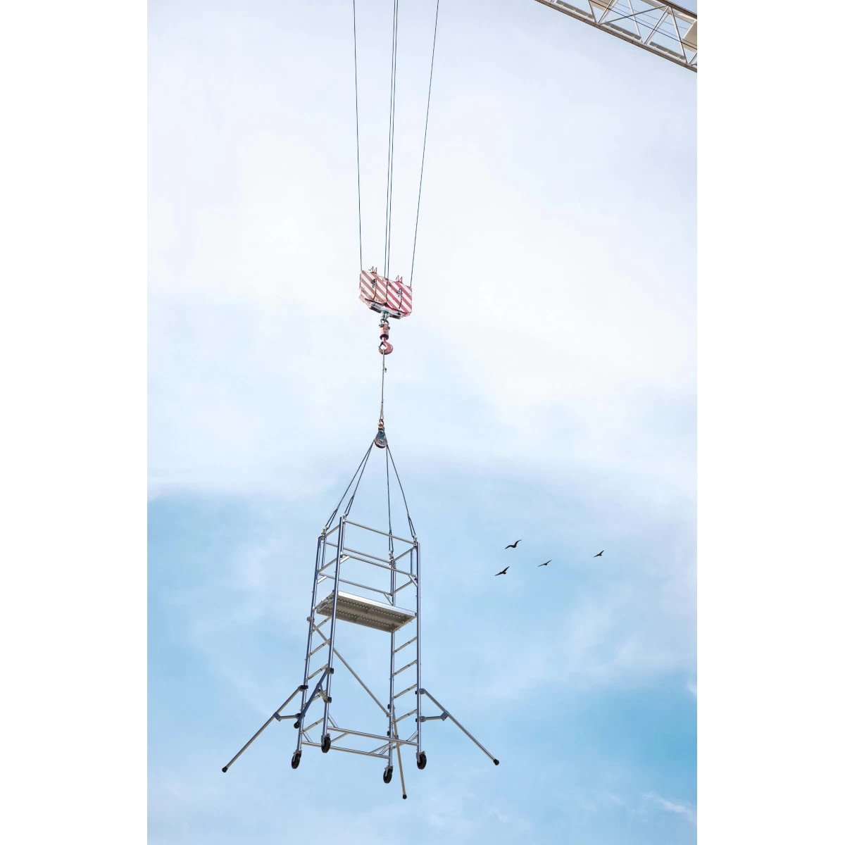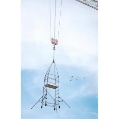Sa structure est composée de montants de diamètre 45 mm. Il dispose d’un double plancher en acier, de 2 garde-corps anti chute.