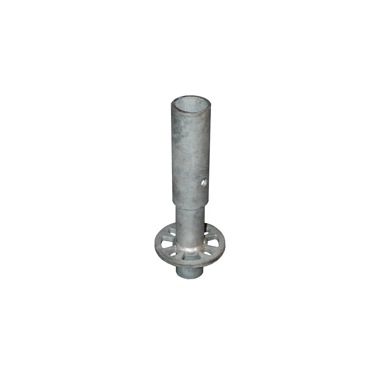 L’embase de départ pour échafaudage multidirectionnel se fixe sur le socle et est équipée d’une rosace à 8 trous permettant de fixer une moise de jonction dans n’importe quelle direction.