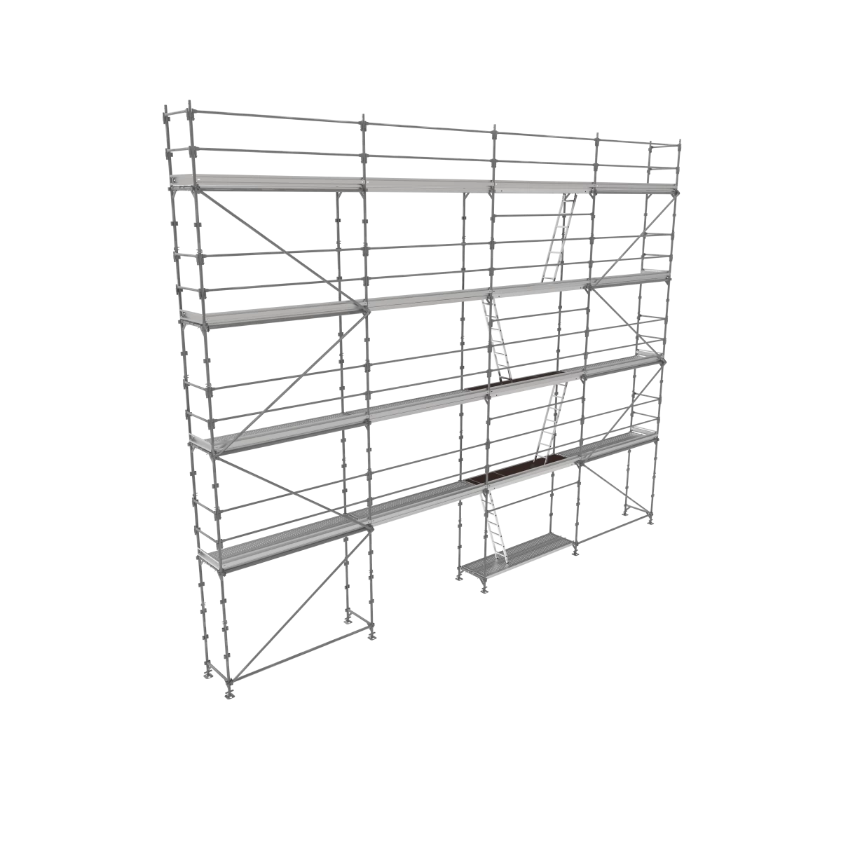 Ce lot d’échafaudage en diamètre 45 mm dispose d’une surface de travail de 13 x 10 m, soit 130 m² (Longueur structure : 12.00 m – Hauteur plancher : 8.00m).