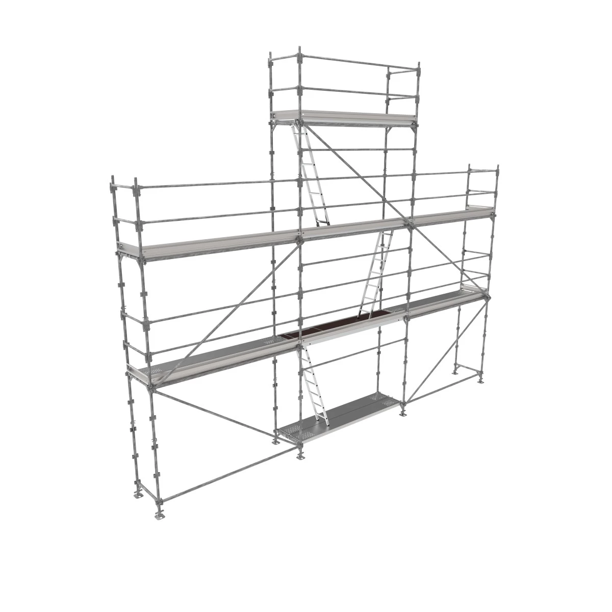 Ce lot d’échafaudage en diamètre 45 mm dispose d’une surface de travail de 10 x 6 m, soit 60 m²+ pignon 3 x 2 m (Longueur structure : 9.00 m – Hauteur plancher : 6.00 m).