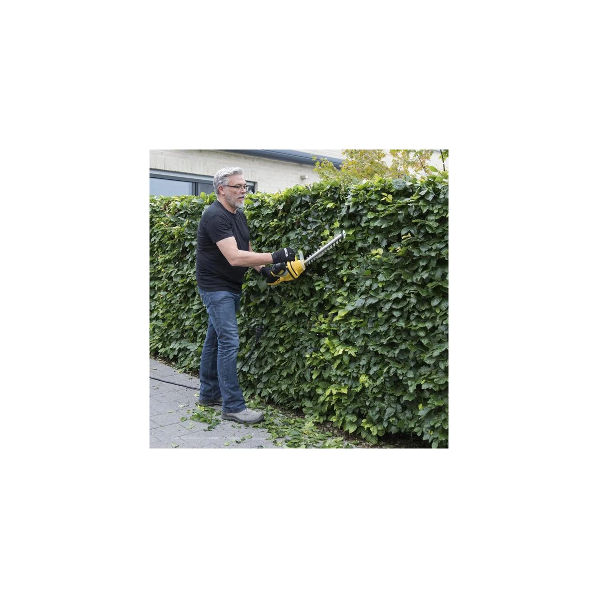 Taille haies Power Plus avec deux poignées, protection et trou de suspension sur l’extrémité de la lame.